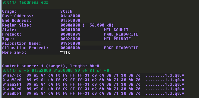 儘管如此,我們仍然要先學習怎麼計算 offset,還記得我們剛剛移動到 lpBuffer 的錨點嗎? 錨點目前應該指向 WPM Skeleton 的 lpBuffer。首先我們可以使用以下 windbg 指令來取得當前的 stack 範圍,並在 stack 中尋找我們的 shell code。