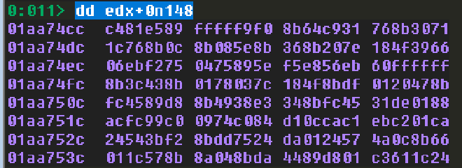 接著我們確認看看從 edx + offset 後是不是在正確的 address,也就是 shell code 所在的 address。