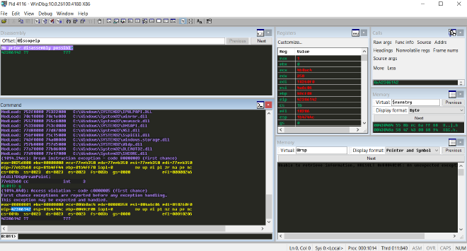 透過 windbg 的畫面我們可以看到 overflow 已經成功,我們觸發了 access violation。這是由於我們的 overflow 將 eip 蓋過去,使得程式要執行的下一個指令,也就是 eip 被我們控制,然而我們的 eip 並不是一個有效的 address,是我們剛剛用 kali 產生的不重複字串,使得訪問該 address 時發生了錯誤,所以才觸發了 access violation。可以觀察到此時的 eip 在訪問 0x42306142 時發生了 access violation 。