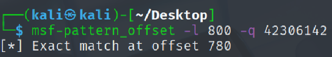 接著我們同樣能夠透過 kali 將 eip 的 value 計算成確切的 offset。我們確定了前面覆蓋到 eip 的 0x42306142 是在 offset 為 780 的地方。這表示在 eip 被覆蓋前,我們需要 780 個字元來填充才會造成 overflow。