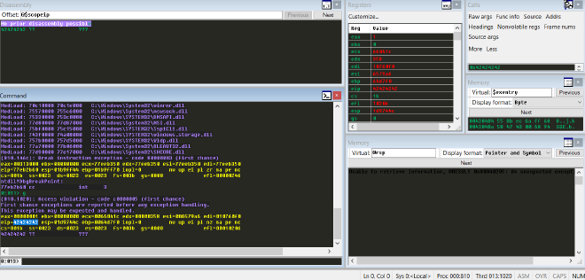 而你要做的第一步就是跟目標程式來一場猜數字的遊戲,猜到能夠讓目標程式 crash 的數字。這個過程取決於你的運氣,但總能猜到的。對我而言猜數字並不困難,比較麻煩的是這隻目標程式每次 crash 後都需要我自己去重啟 service 再 attach windbg 上去。老實說這真的很頭痛,但總而言之,我猜出了這個能讓目標程式 crash 的數字是 800。