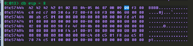 觸發 overflow 後可以在 windbg 上使用以下指令來查看 esp,可以看到在我們把 esp 覆蓋成 0x42424242 後,後面原本應該要是從 0x01 ~ 0xff 的所有字元,結果在 0x09 後面不是 0x0a,變成了 0x00。這代表 0x0a 是 badchar。我們需要從 badchars 中把 0x0a 移除,然後重新再跑一次。重覆這個過程直到找出所有 badchar。