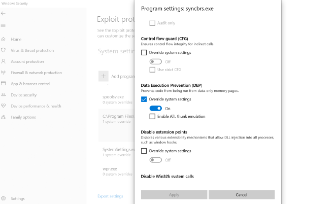 Exploit protection settings