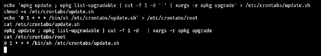 echo 'opkg update ; opkg list-upgradable | cut -f 1 -d ' ' | xargs -r opkg upgrade' > /etc/crontabs/update.sh