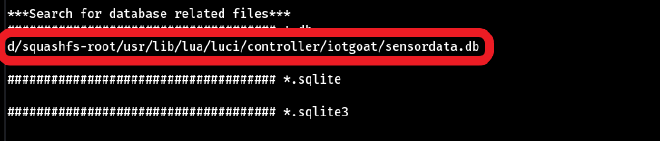 我們同樣可以透過 IoTGoat 的實作來觀察該弱點。在 Firmwalker 掃描的結果中可以發現從韌體中提取出來的資料存在結尾為 .db 的檔案 sensordata.db,有極高機率是資料庫的儲存檔案。