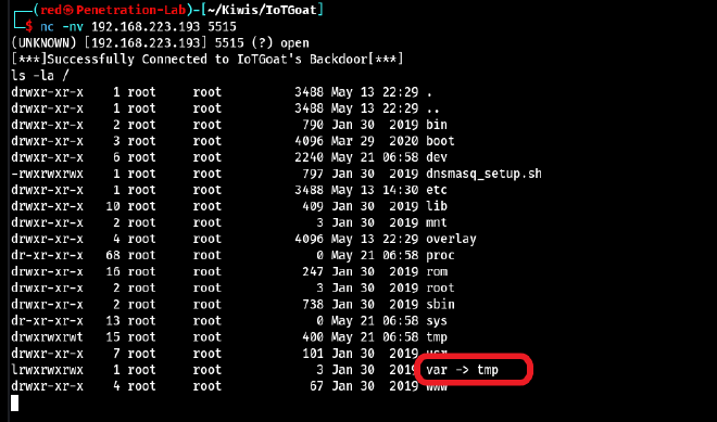 我們同樣可以透過 IoTGoat 的實作來觀察該弱點。使用 IoTGoat 的後門進入系統內,可以發現 IoTGoat 根目錄下的 /var 直接被連結到 /tmp,導致在系統每次重新啟動,所有 log 都會被系統刪除。
